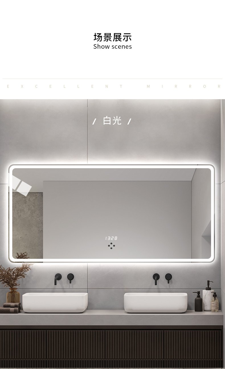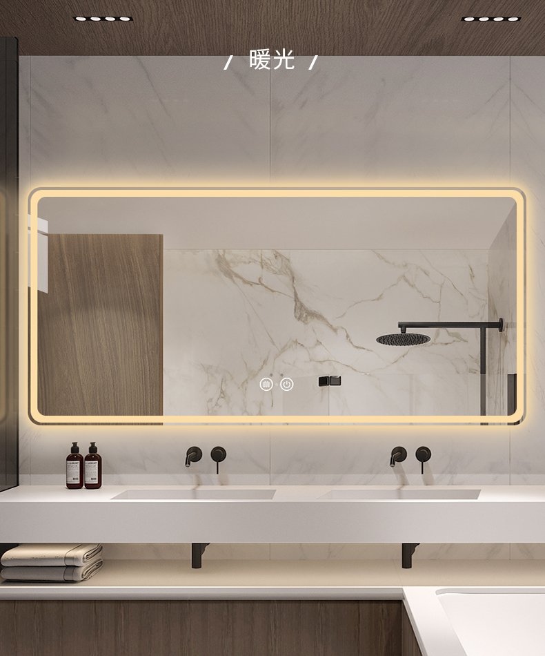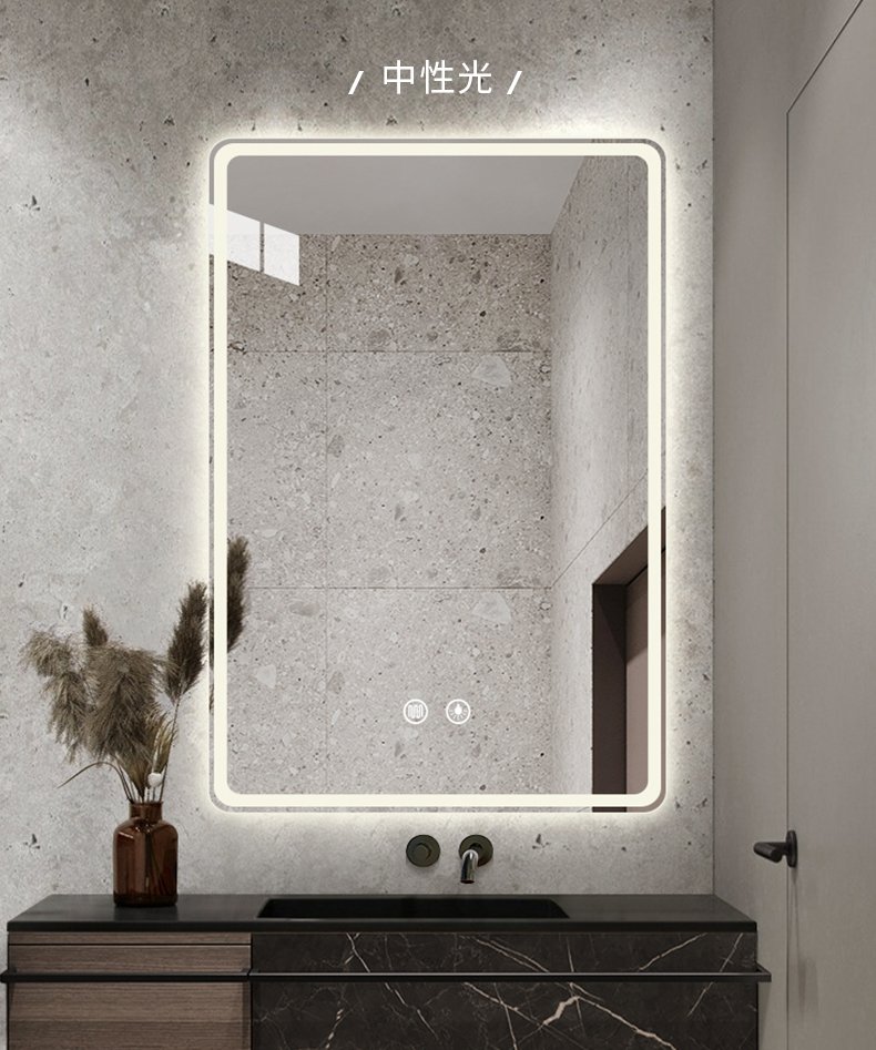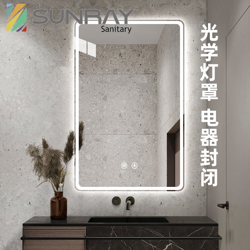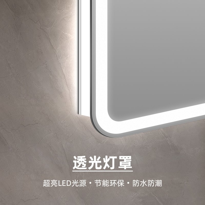 Square bathroom mirror without sandblasting, with rounded corners and light