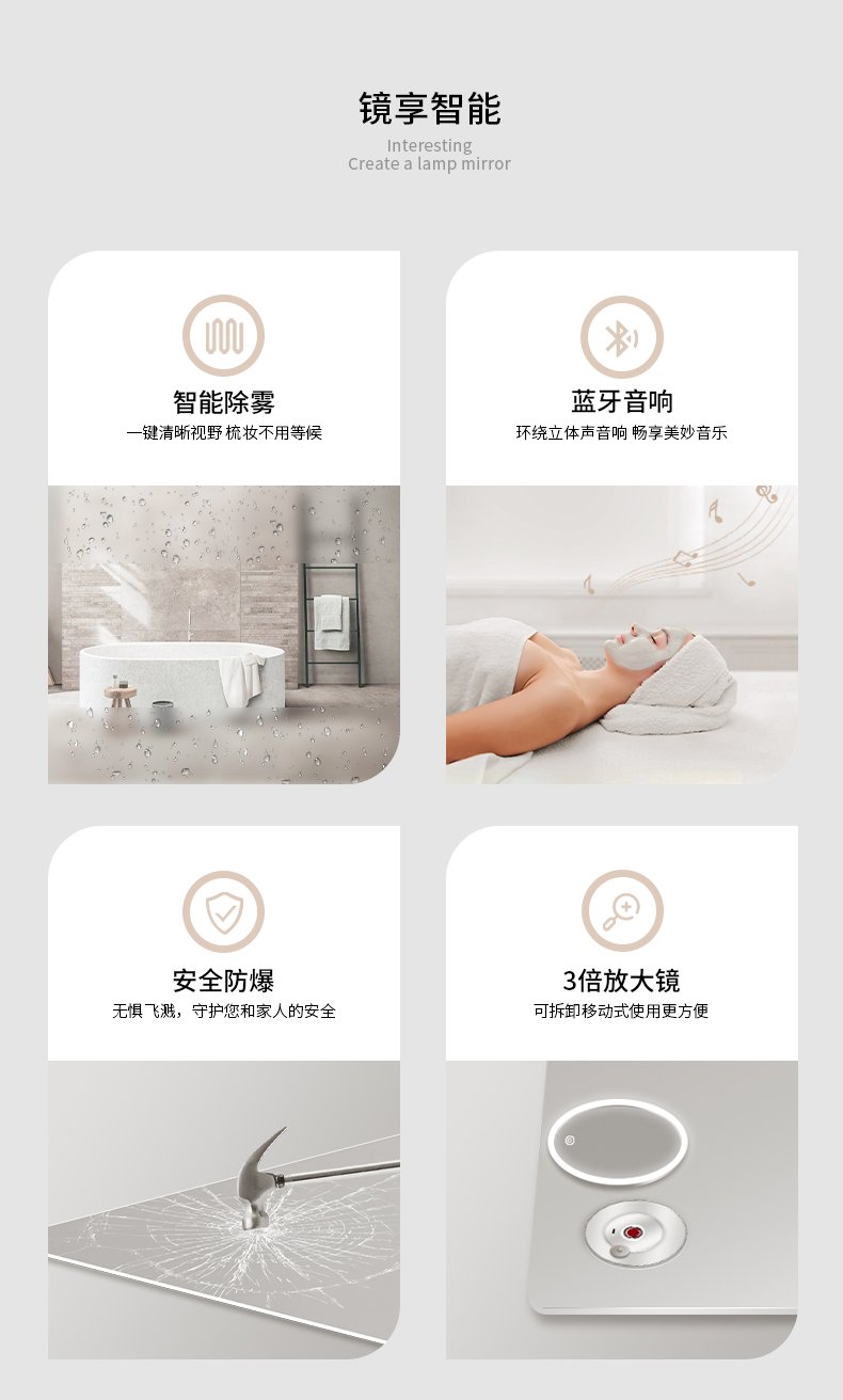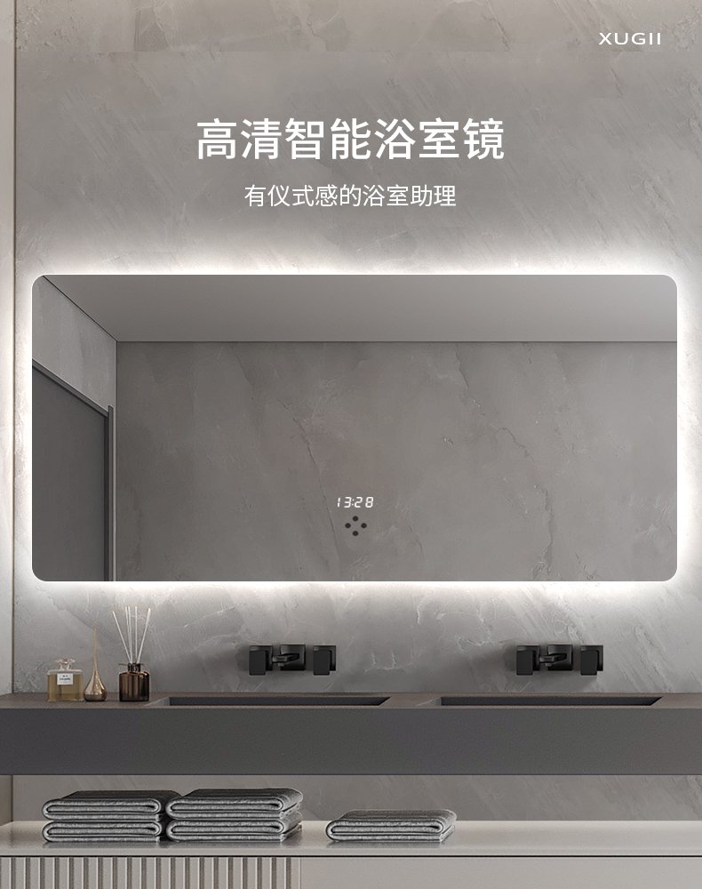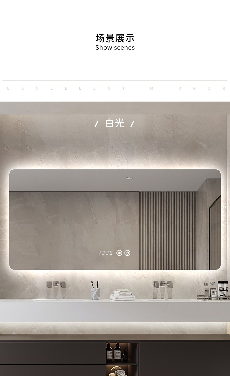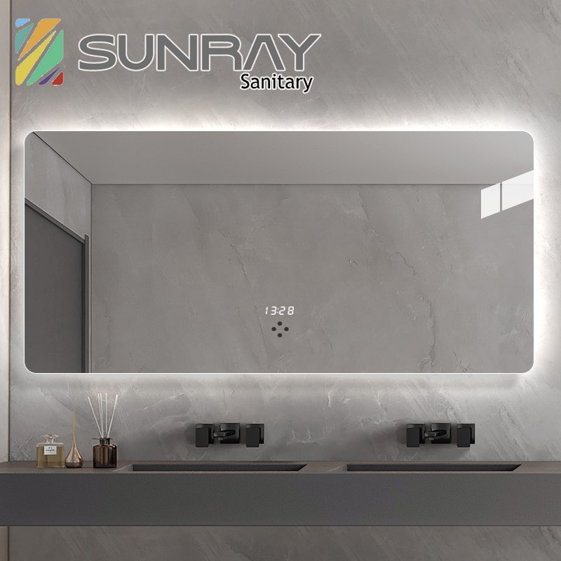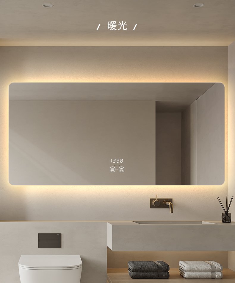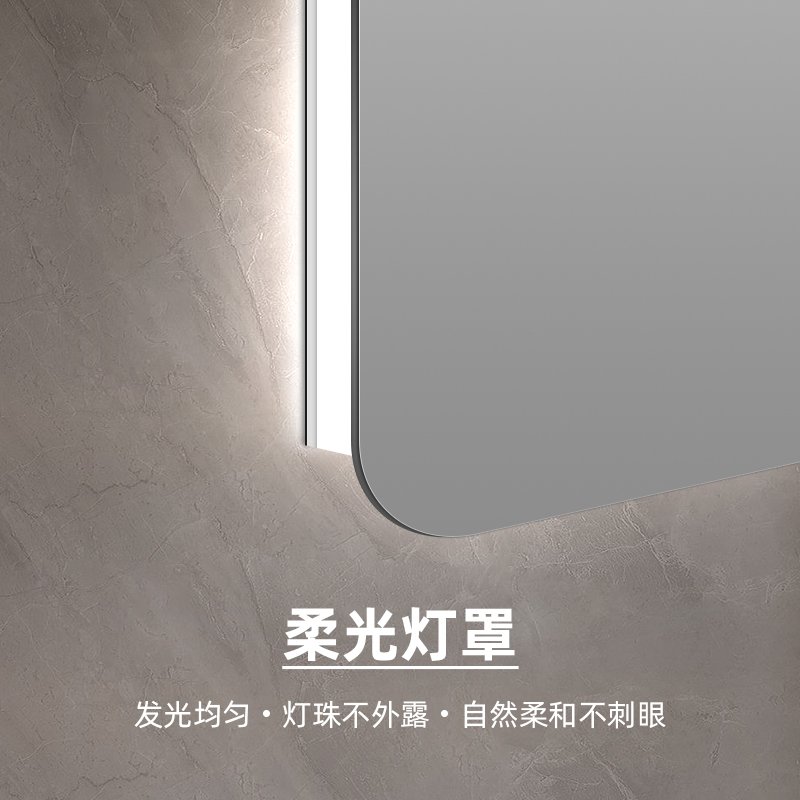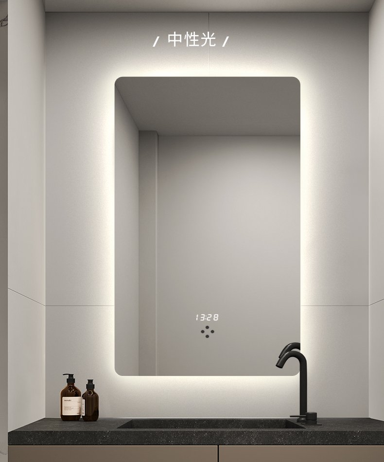 Square bathroom mirror without sandblasting, with rounded corners and light